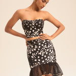 تظهر التنورة غير المتناظرة المنسقة زينة من الدانتيل على الحافة وحزام الخصر، مما يضيف حركة ديناميكية، وملمس، وبيان معاصر لافت.