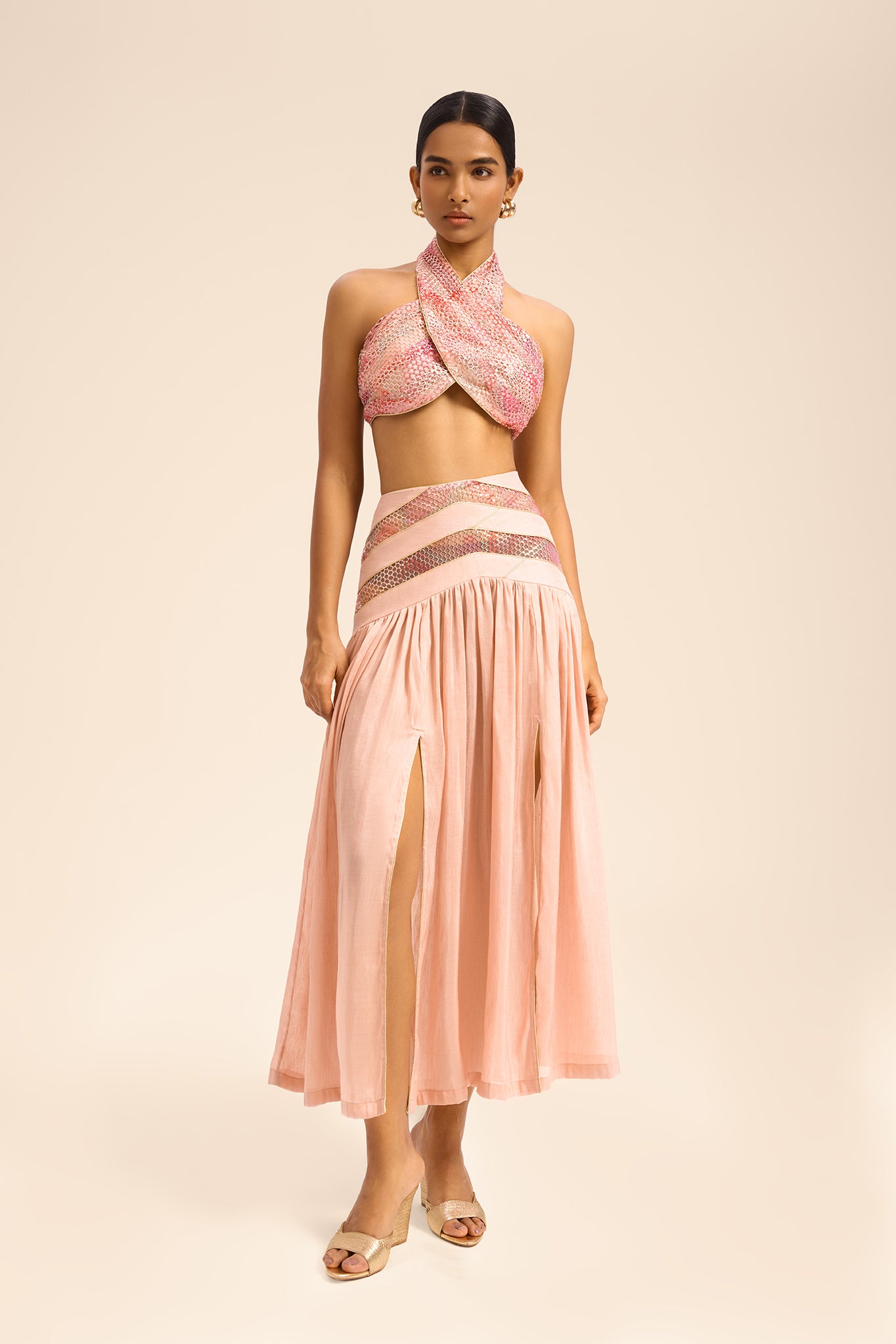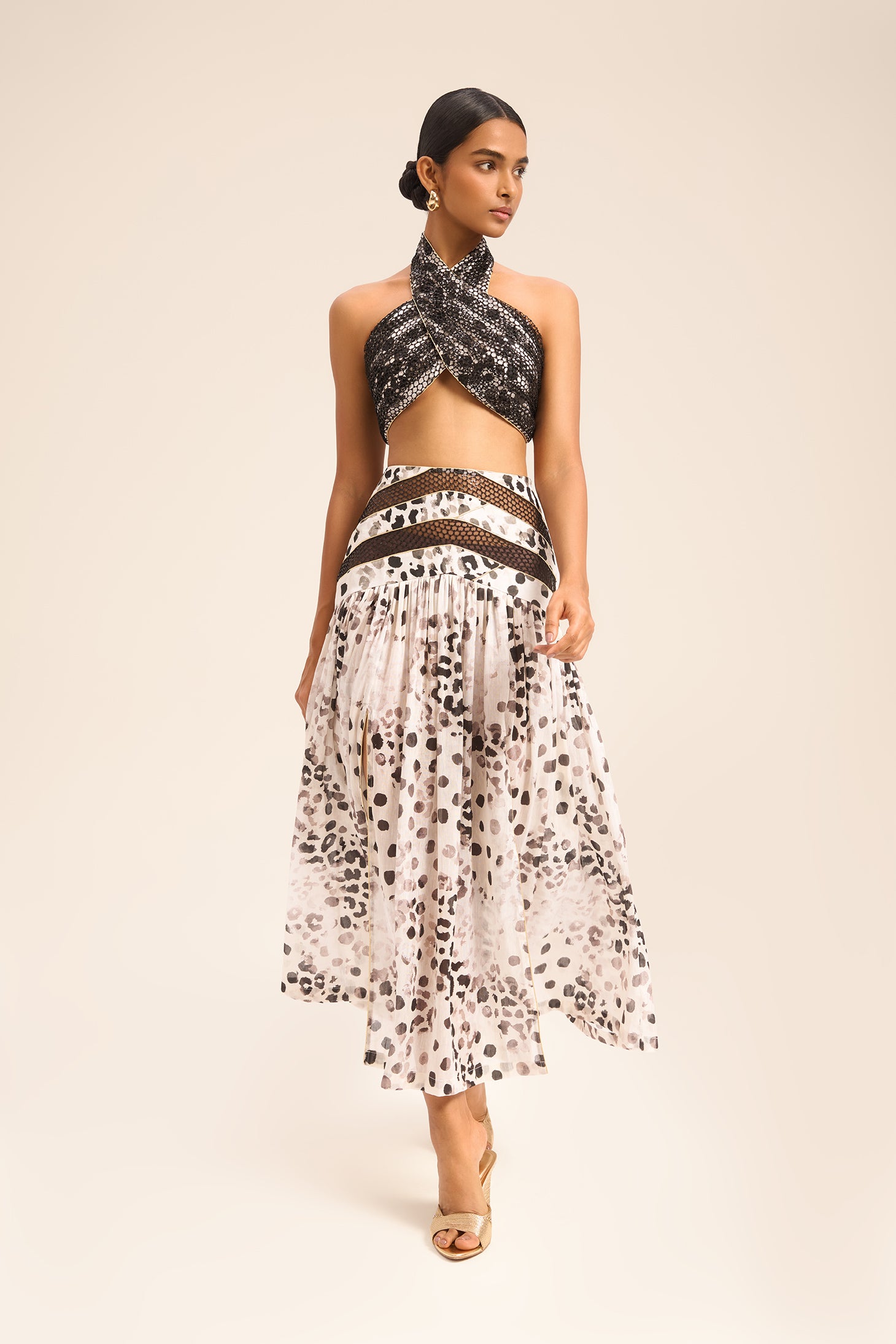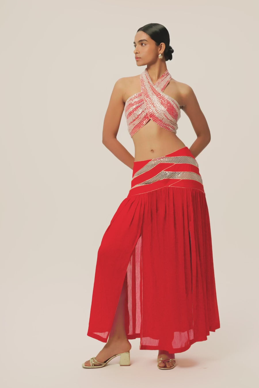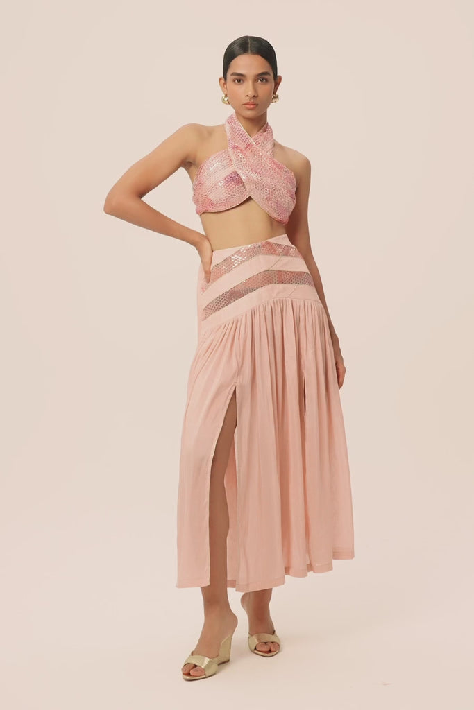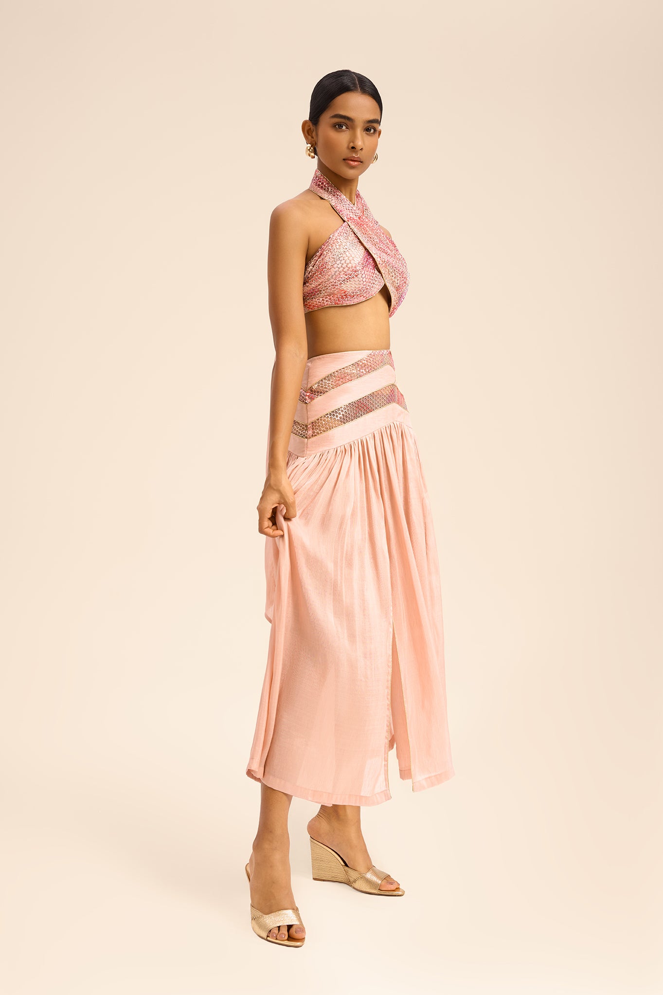 تتميز التنورة المهيكلة بطيّات ناعمة متصلة عند خط الخصر، مما يخلق حركة سلسة وجاذبية مصقولة ومرحة في آن واحد.