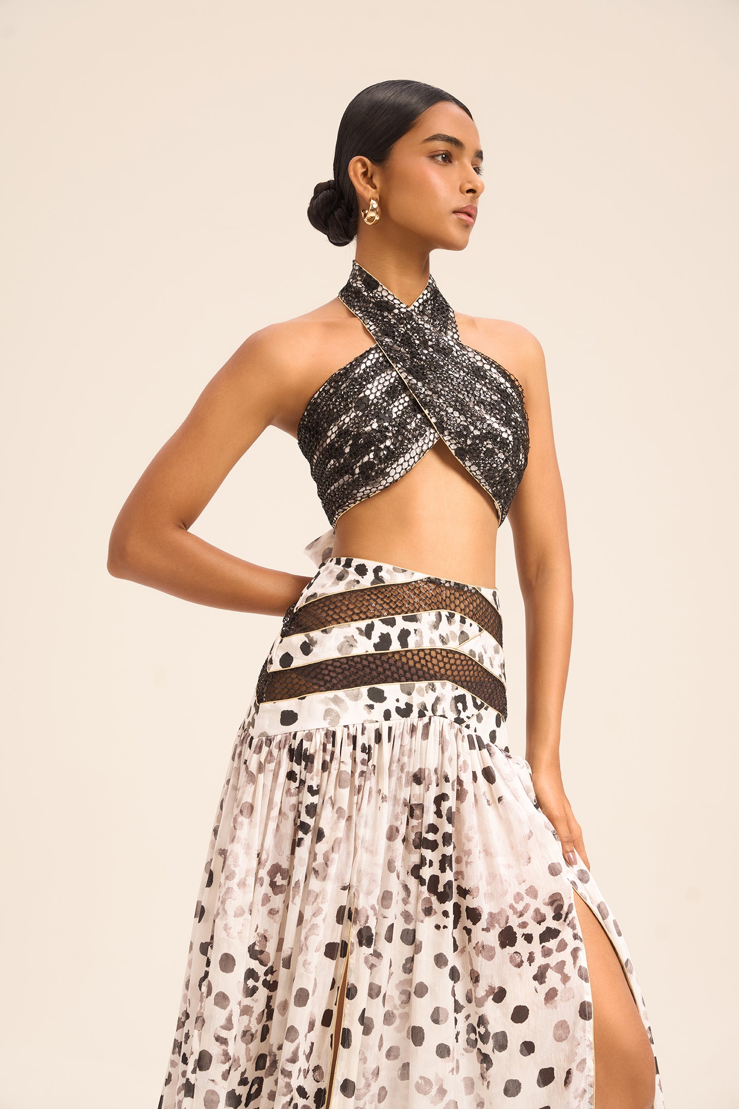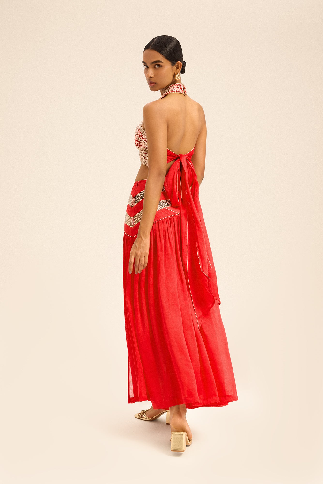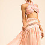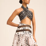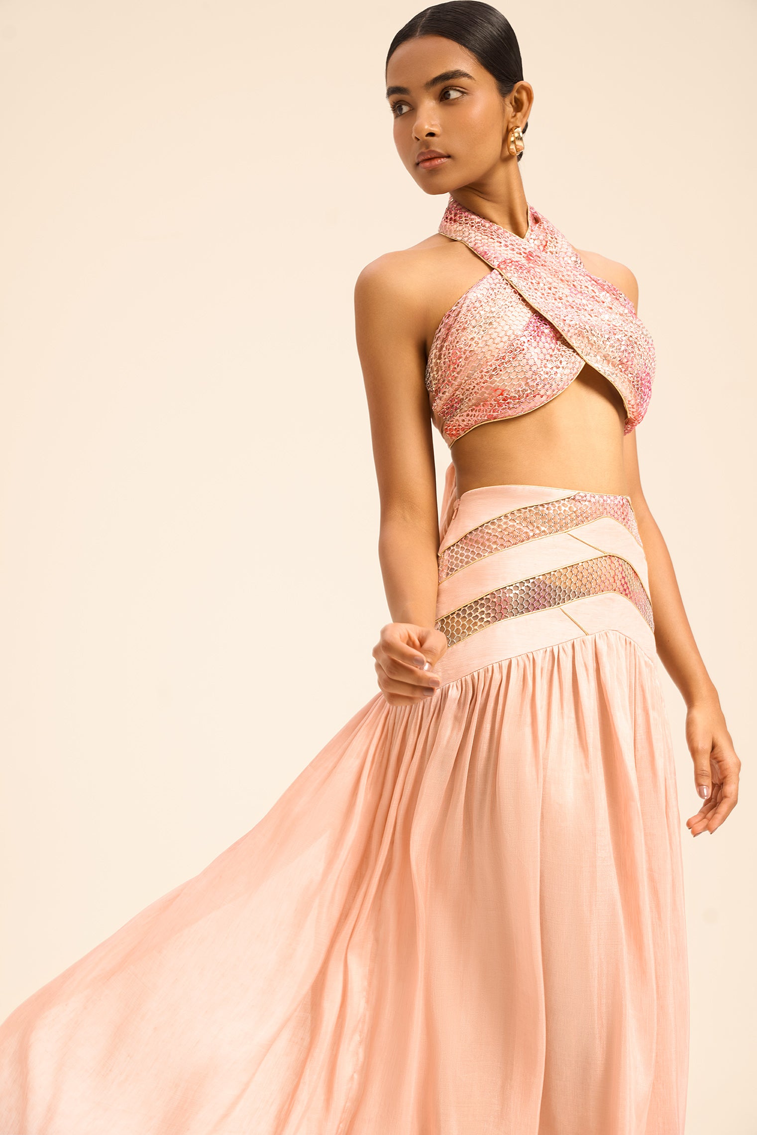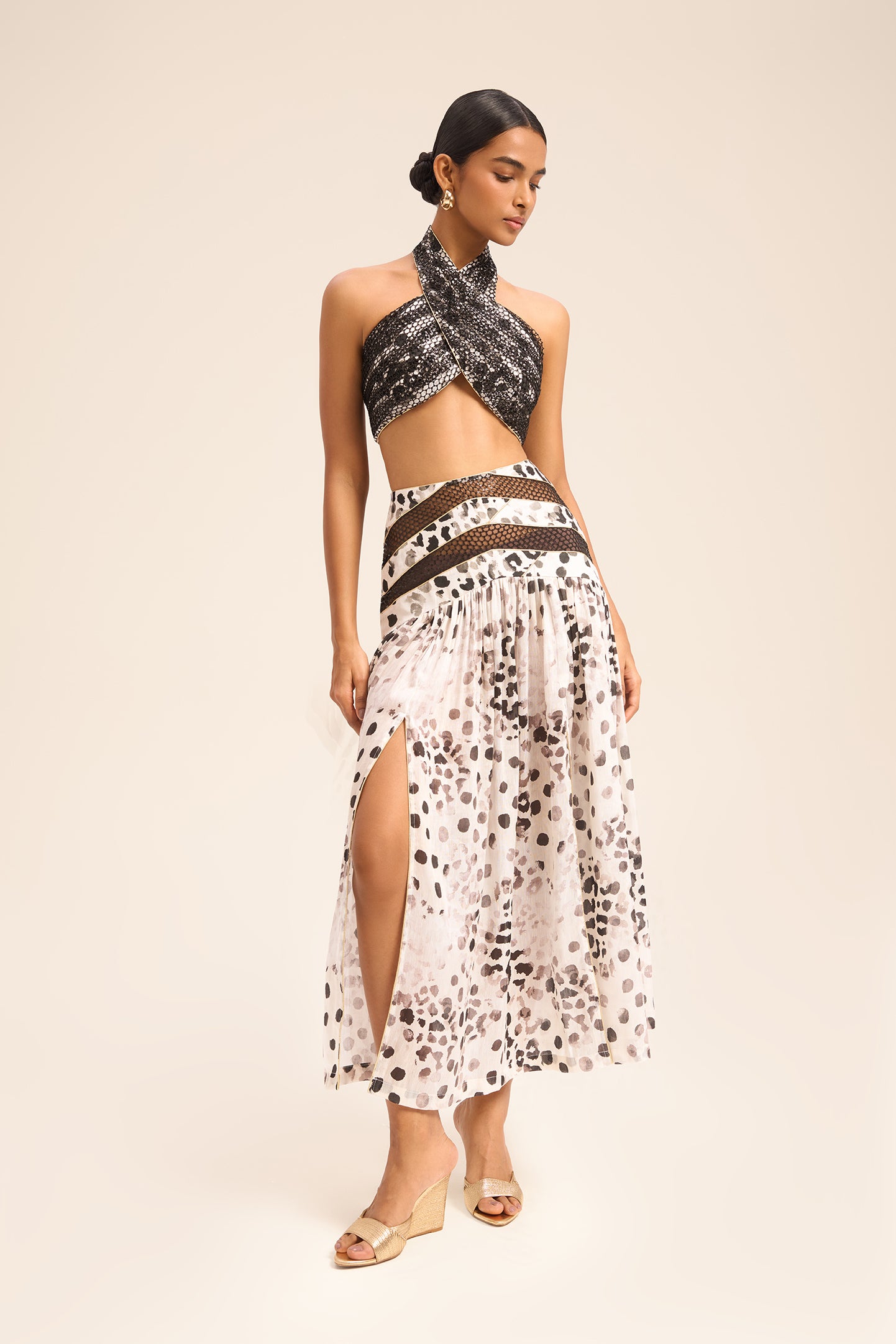 تتميز التنورة المهيكلة بطيّات ناعمة متصلة عند خط الخصر، مما يخلق حركة سلسة وجاذبية مصقولة ومرحة في آن واحد.