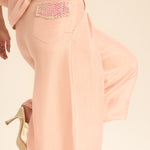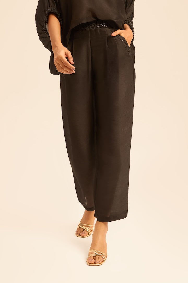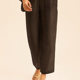 بنطلونات عالية الخصر بقصة مستقيمة مع حلقات حزام مزينة بالخرز تخلق شكلًا ممدودًا وسلسًا يوازن بين الهيكل العصري والحركة السهلة.