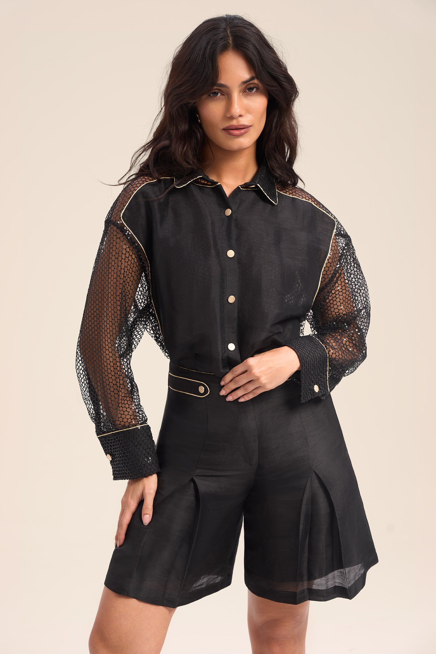 Polished gold-tone buttons elevate the look with refined contrast and a touch of sophistication.