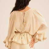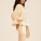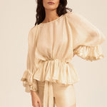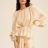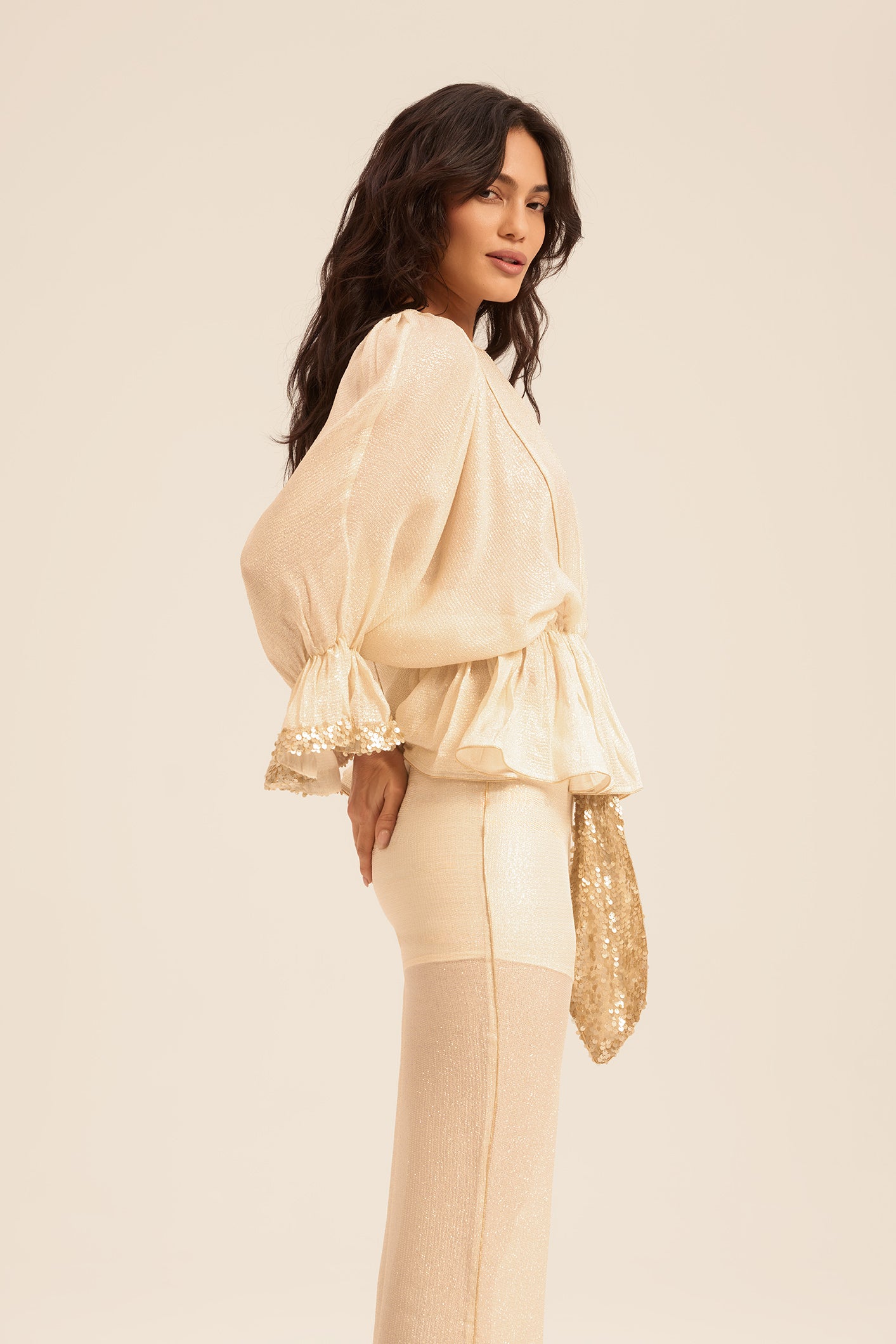 Structured yet feminine, the shirt is designed to define the waist and sculpt the silhouette while maintaining an effortlessly polished appeal.