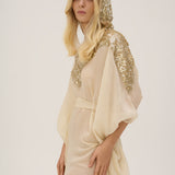 Embrace effortless luxury with the Artemis Silk Kaftan Dress. Crafted from radiant shiny silk and adorned with shimmering sequins, this free-size statement piece brings modern elegance to every occasion.