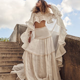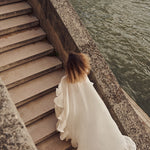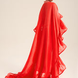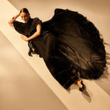 A distinctive front-short, back-maxi tail design creates dramatic flow and graceful volume with every step. -