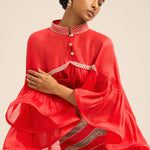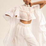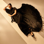 Delicate fishnet accents along the collar and front frill add modern texture and striking contrast to the elegant silhouette. -