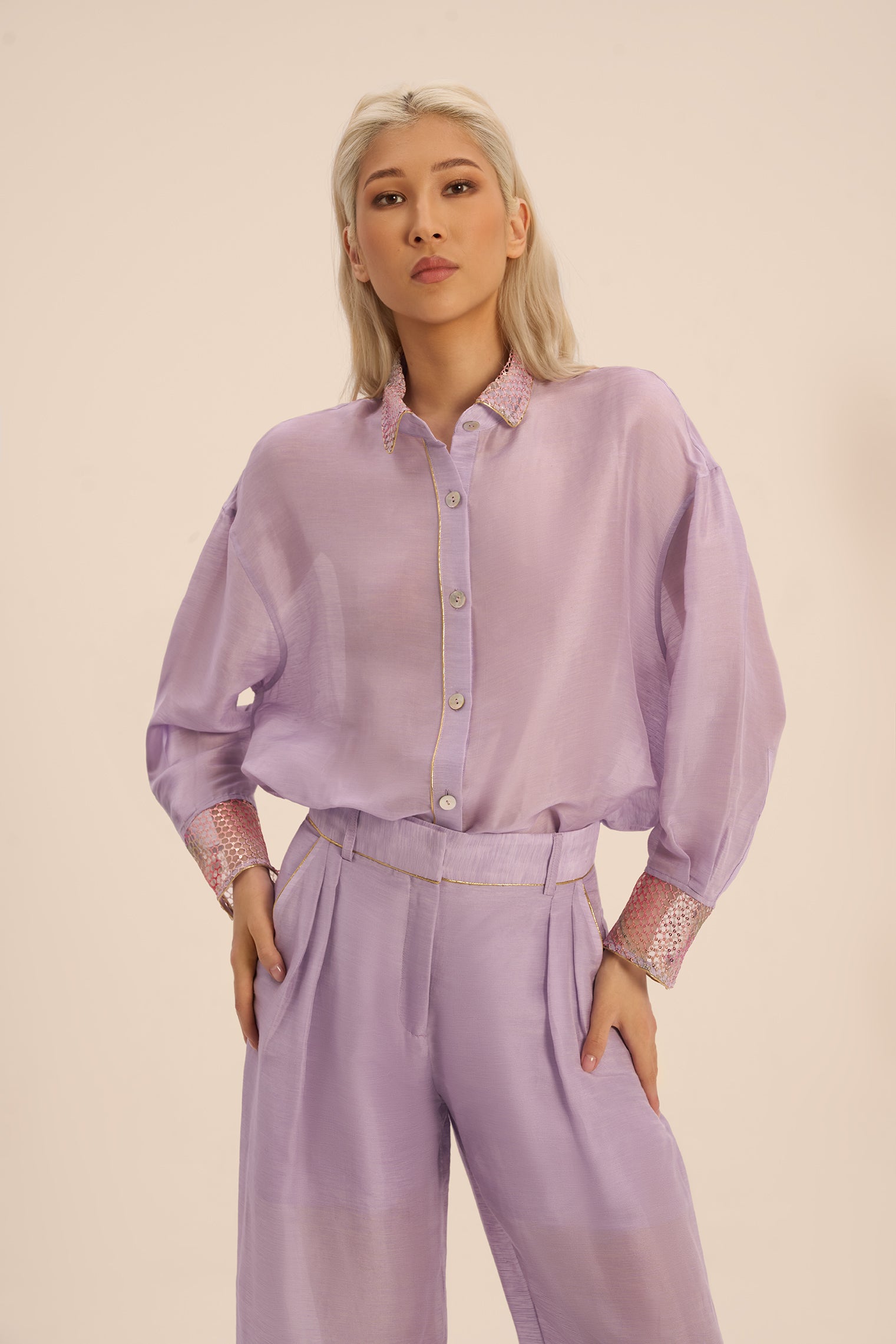 Includes straight-cut pants that elongate the silhouette and offer relaxed elegance