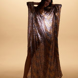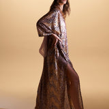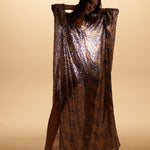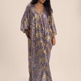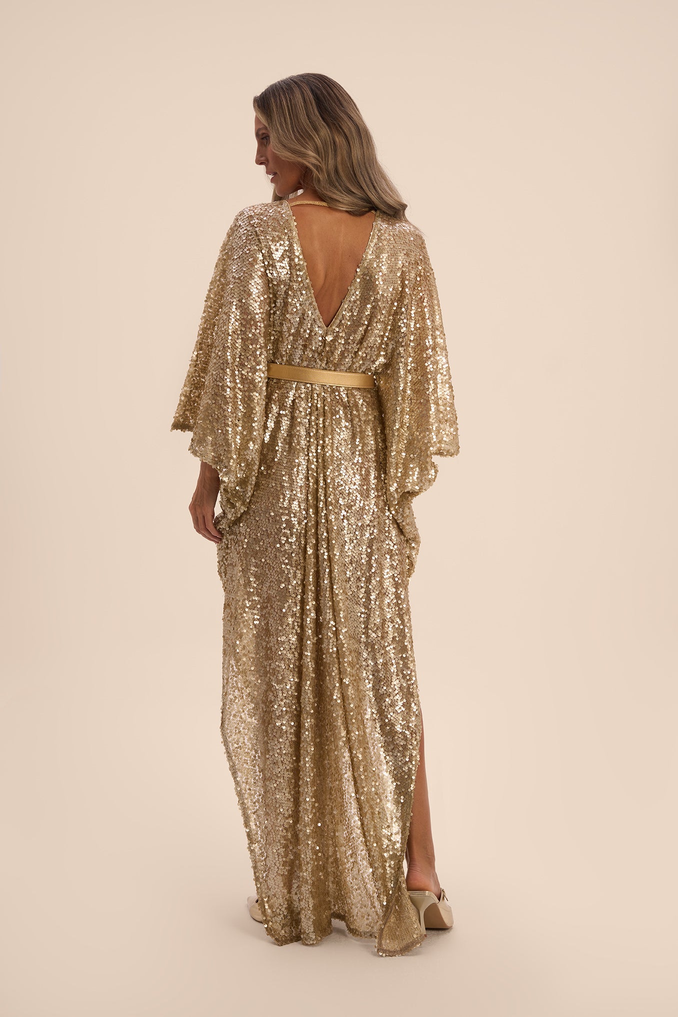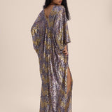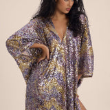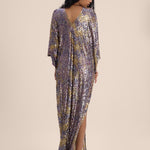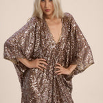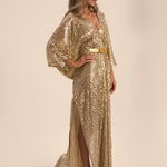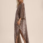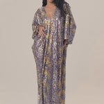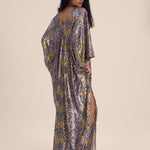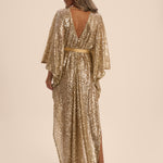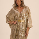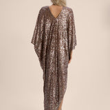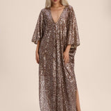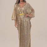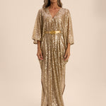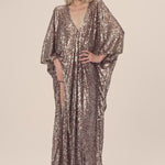 The Marie Lou Sequin V-Neckline Kaftan, shimmering sequins that catch the light from every angle, creating an effortlessly luxurious look.