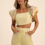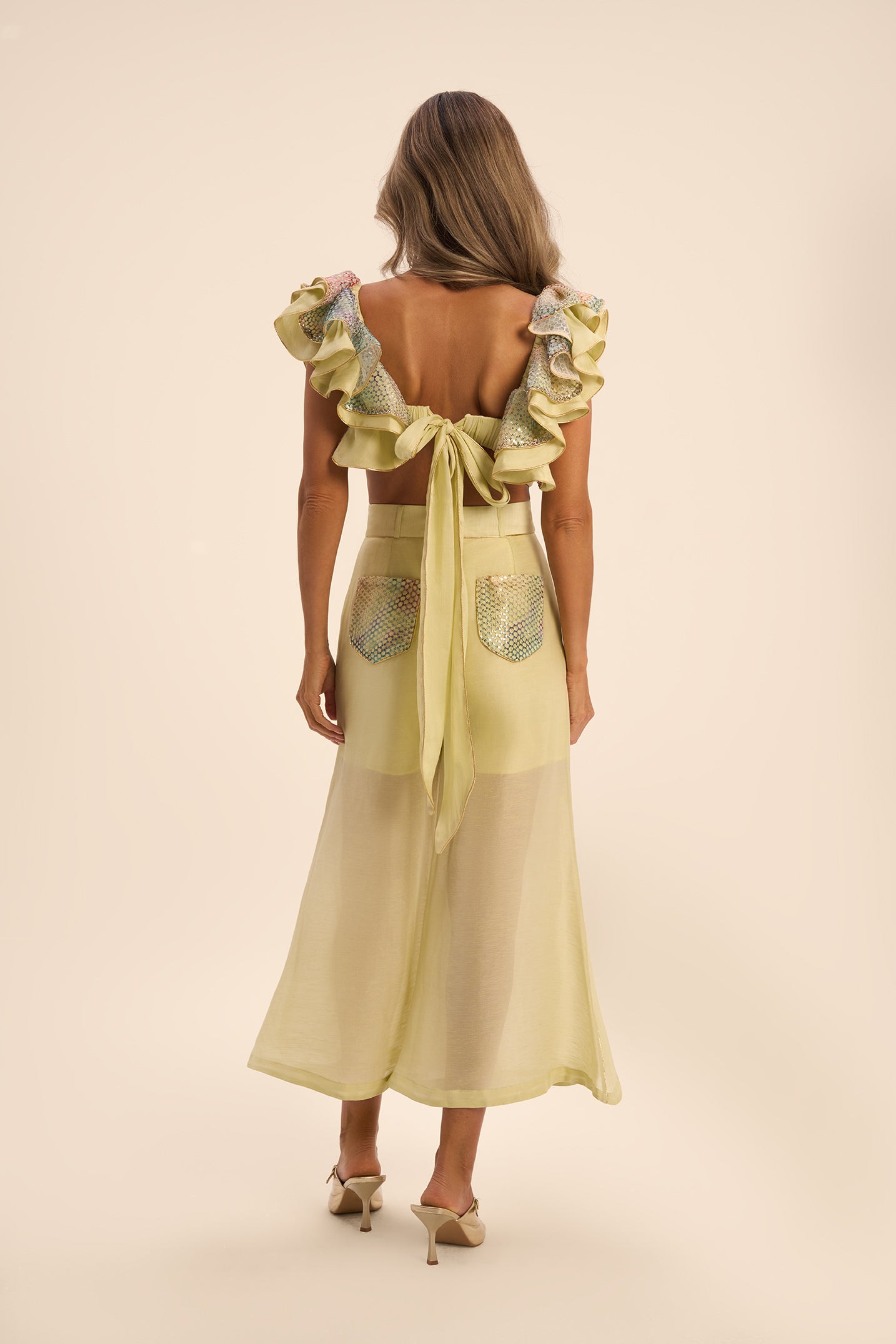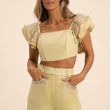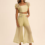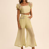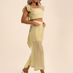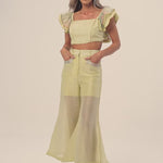 Elevate your everyday glam with the Mili Top and Pants Set, a bold-meets-beautiful duo. The top brings flirty charm with soft frill sleeves, finished in edgy fishnet trim and a back tie-up. The Pants complete the look with sleek tailoring, flared hems, and subtle fishnet-trimmed pockets—effortless drama, redefined.