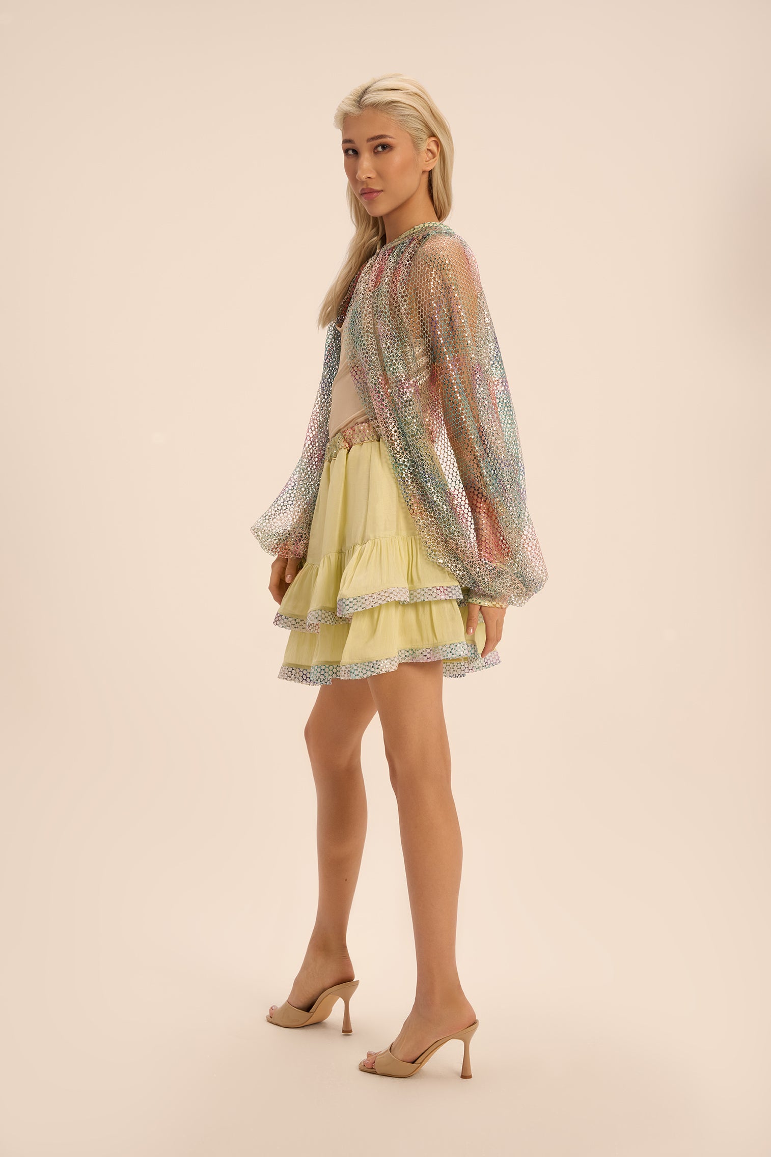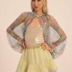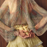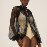 Turn heads in the Narui Sleeve Top, a daring yet delicate piece designed for maximum versatility. Crafted in a sheer, lightweight fabric with striking open fishnet sleeves, this top adds instant edge and glamour—whether layered over a bikini for beachside chic or draped over a sleek gown for a fashion-forward finish.
