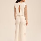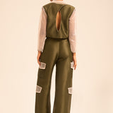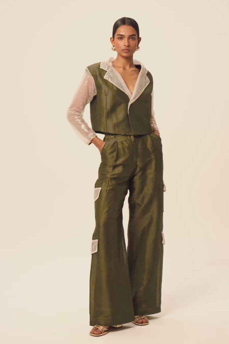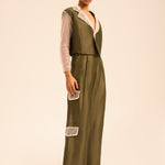 The contrast of the matte linen–silk texture with shimmering sequin accents delivers a harmonious play of sophistication and shine — ideal for refined, statement dressing.