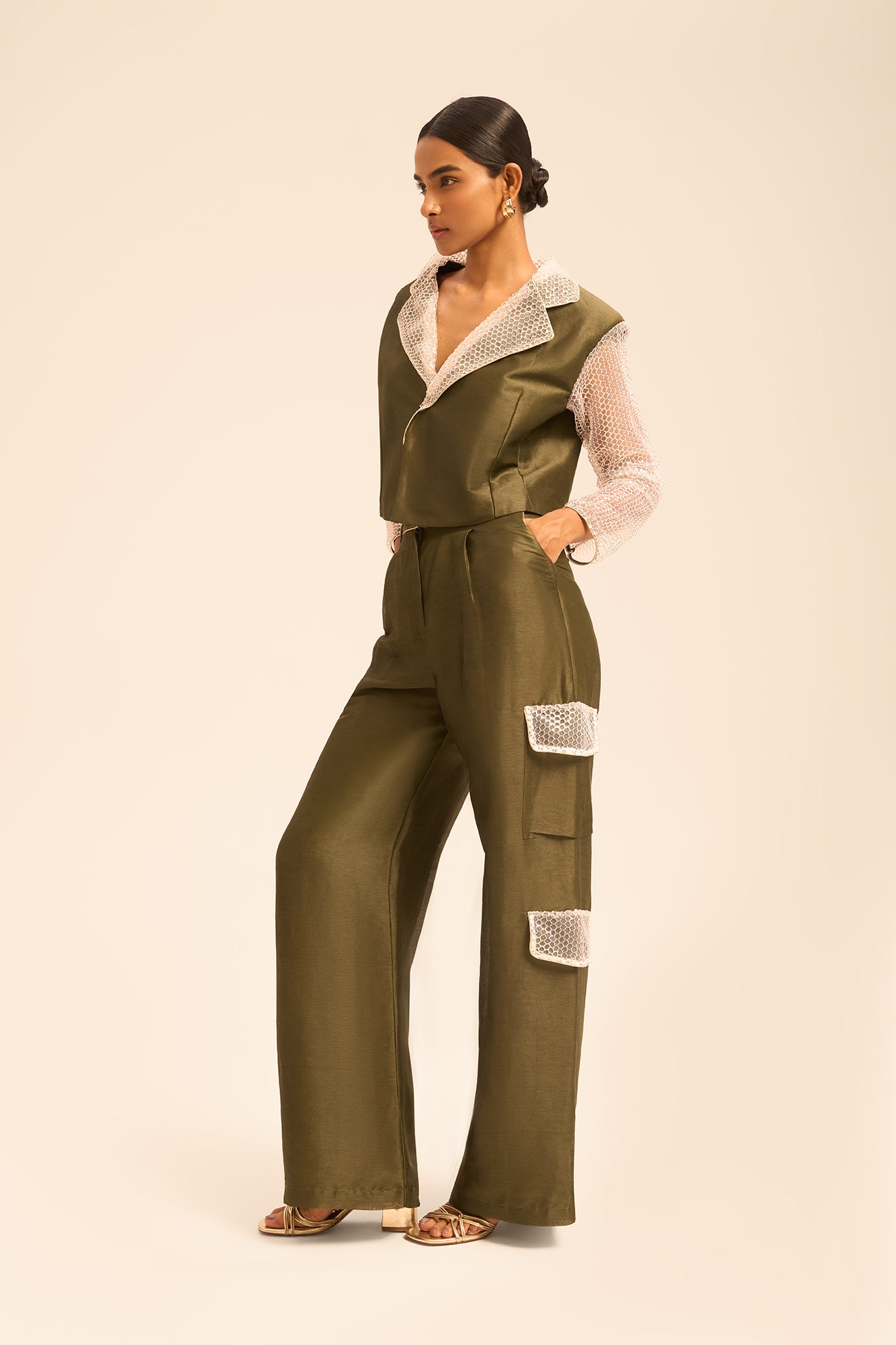 Crafted from a rich blend of linen and silk, the ensemble exudes understated luxury with a natural sheen and soft drape — offering breathability, comfort, and a refined finish.
