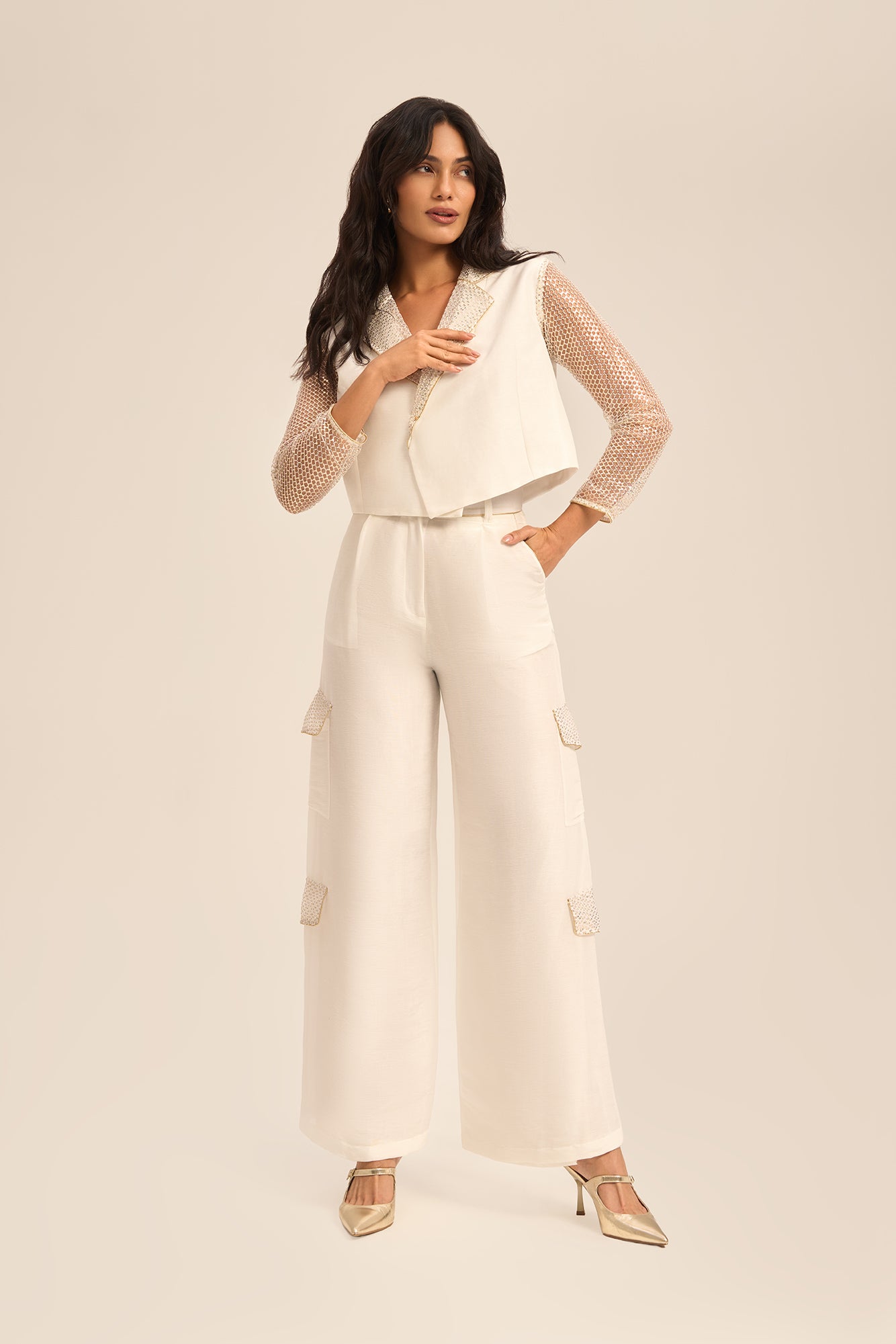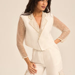 The short-length blazer is elevated with intricate fishnet sequin trimming along the collar, adding a luminous highlight and touch of modern glamour to the classic tailored form.