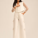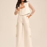 Sleek straight-leg trousers create a clean, elongated line, perfectly complementing the cropped blazer and adding balance to the overall look.