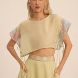 The Sophia Top and Skirt Set brings a modern twist to feminine dressing. The top features drawstring detailing at the sides for customizable shaping, while bold fishnet-trimmed sleeves add an edgy, urban feel.