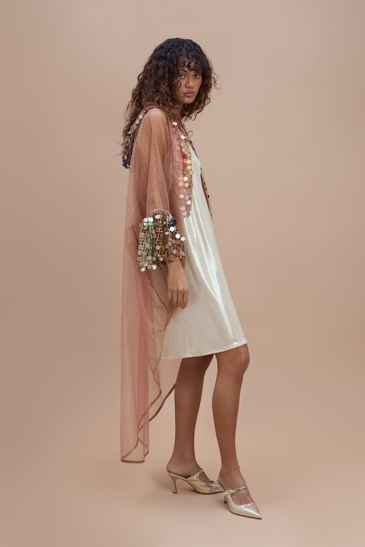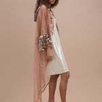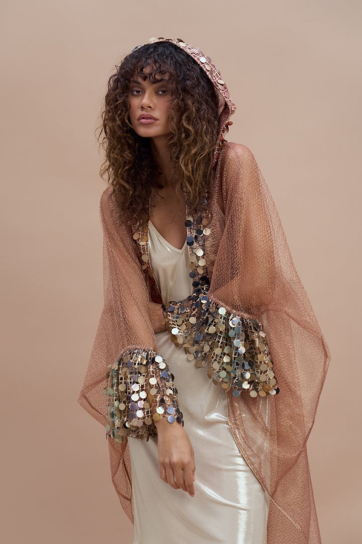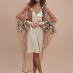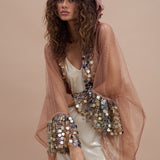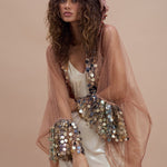 Introducing the Zerina Kimono, a stunning combination of tulle and sequin embellishments that create a mesmerizing, ethereal look.